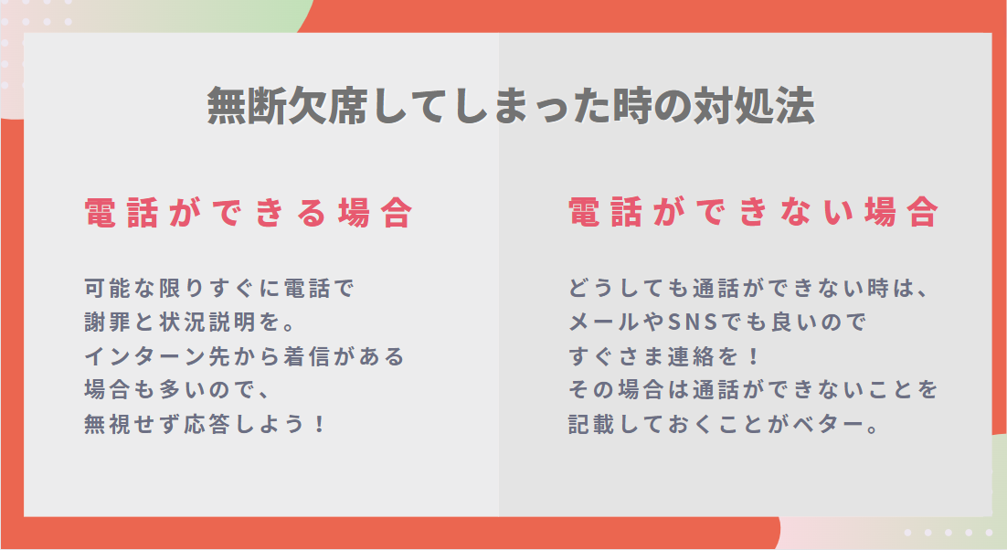 理由は何であれ、長期インターンを無断欠席してしまった後に音信不通になってしまうことだけは避けましょう。