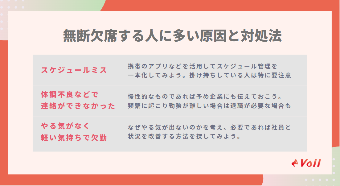 ここでは、長期インターンを無断欠席するときのよくある原因とその対処法を見ていきます。
