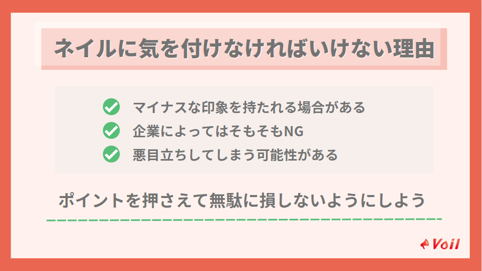なので、ネイルをしているだけで悪目立ちしてしまう可能性が高くなります。