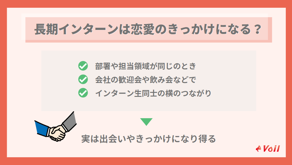 部署や担当業務が同じ場合、仕事上でのやり取りが多くなります。そのため、声を交わす機会も増え、お互いを良く知るようになっていきます。また、長期インターンや学業で忙しく、プライベートな時間が取れない学生でも、長期インターン先に来れば会うことができるので、会えない問題もなくなるのです。