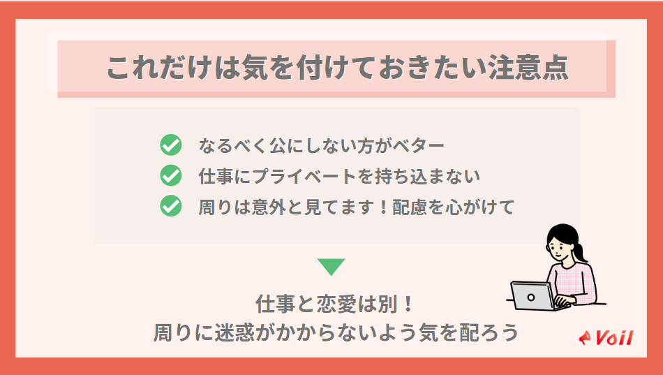 そのため、付き合っていることを公にしている場合、もしくは気づかれて要る場合は、仕事に迷惑をかけないように配慮が必要です。