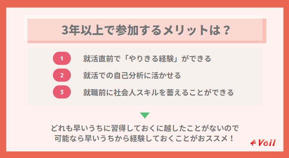 そこで、ここからは3年生以上になってから長期インターンをやる意味を解説していきます。3年生以上で長期インターンへの参加を考えている人は、ぜひ参考にしてみてください。
