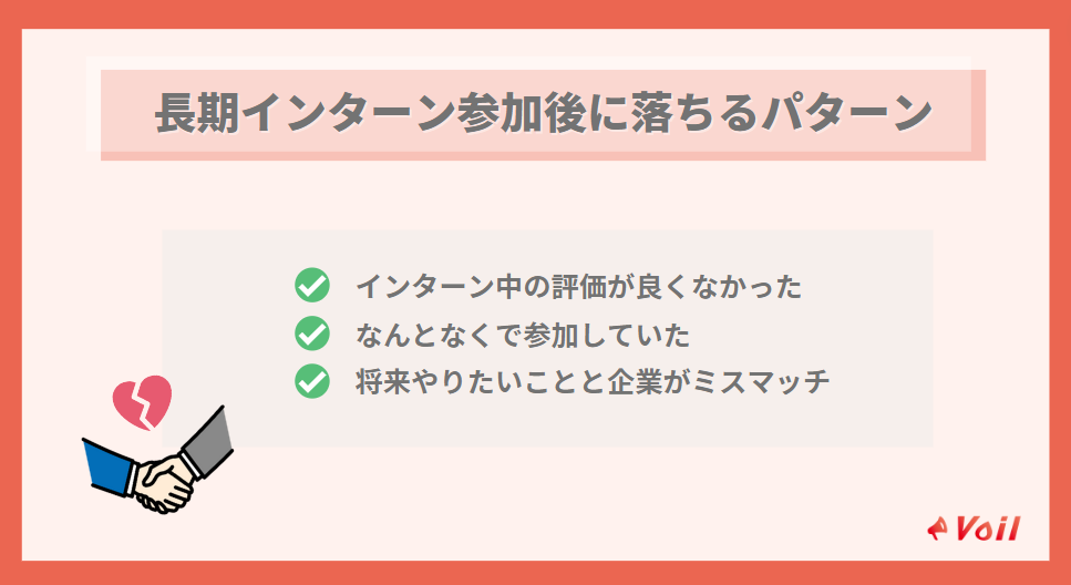 なぜなら、長期インターン中にやらかしてしまい評価が下がっていたり、企業が求める人物とマッチしていなかったりする可能性があるからです。