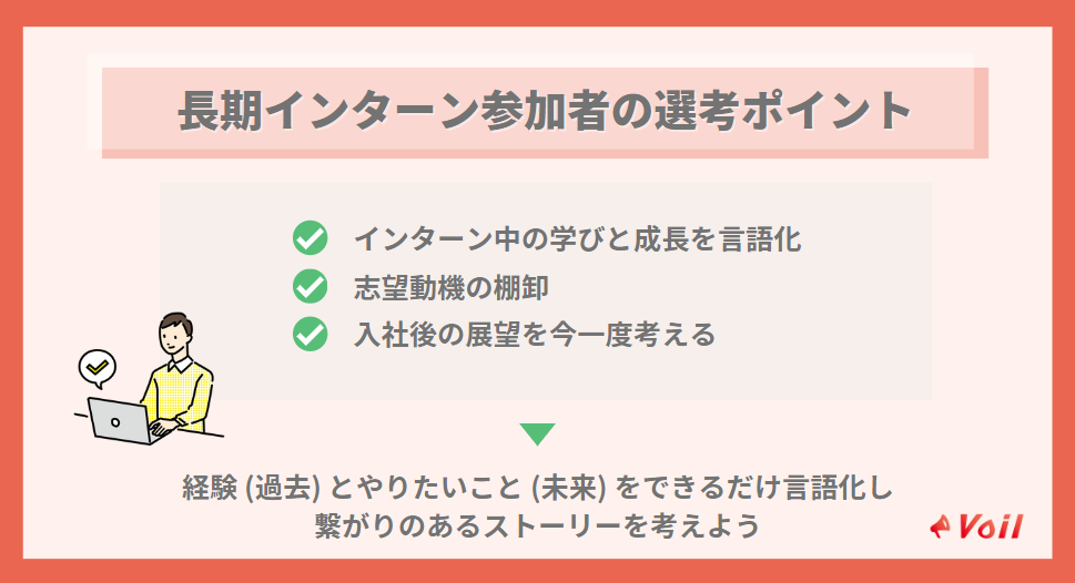 そこで、ここでは長期インターンに参加した人が選考で気を付けるべきポイントを解説します。長期インターン経験を話したいと思っている人は、ぜひ参考にしてみてください。