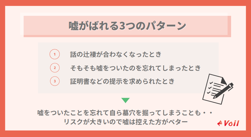 そのため、「前に言っていたことと話がつながらないな」と思われたときに嘘だとバレてしまいますよ。