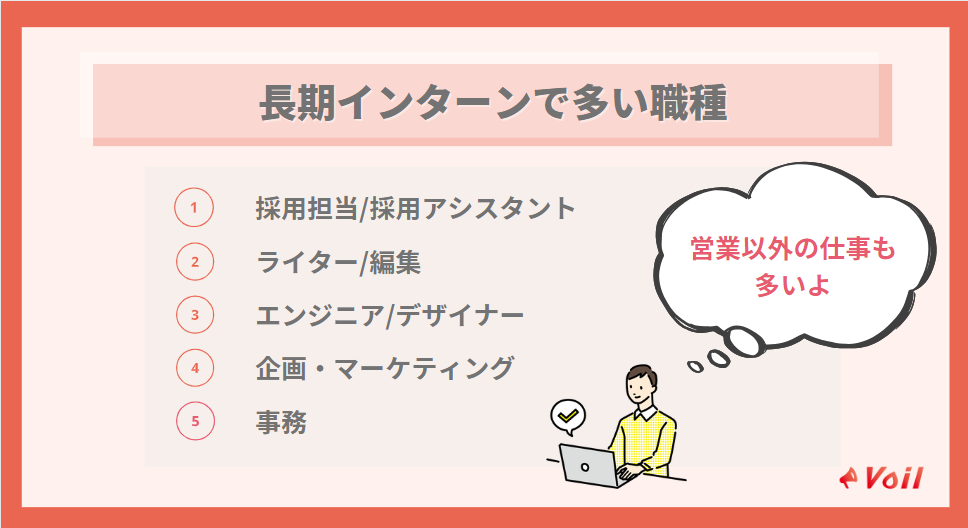 長期インターンの求人は営業が多いですが、経験できる職種は他にもたくさんあります。