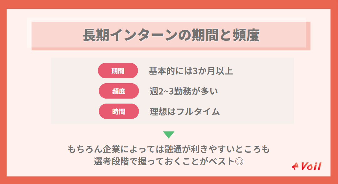 授業やサークルの予定がある学生が長期インターンに参加するには、期間や頻度が気になると思いますので、早速見ていきましょう。