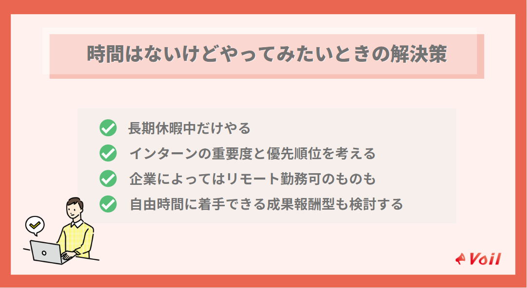 時間がないことで長期インターンを諦めている人は、シフト調整の相談をしたり、リモート勤務ができるインターンを探したりしてみてください。