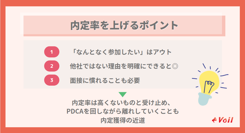 しかし、長期インターンの参加理由を明確にしたり、面接に慣れたりすることで内定率を上げることができます。