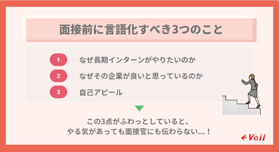 ここでは、長期インターンの面接前に言語化すべき3つの質問を解説します。明確な理由が答えられるように、自分の言葉で言語化しておきましょう。