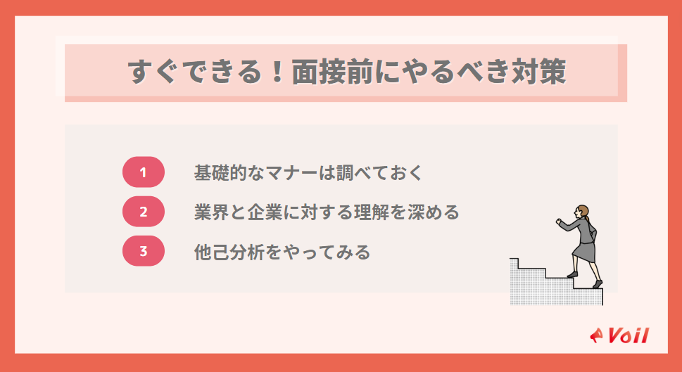 そのほかにも、基本的なマナーを調べ直したり、他己分析をしたりすることもおすすめです。