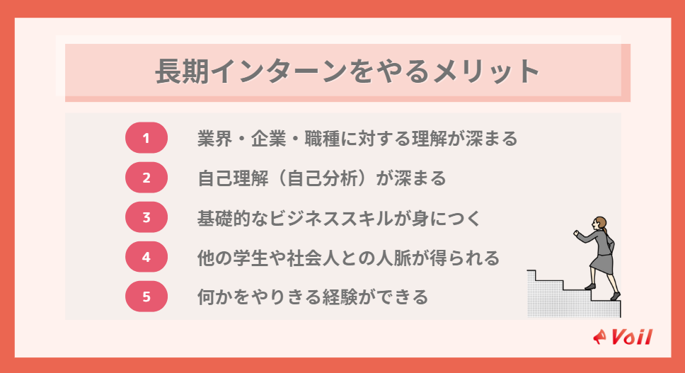 長期インターンでは、実務経験からビジネススキルを身につけられたり、業界理解を深められたりと他のインターンにはないメリットがたくさんあります。