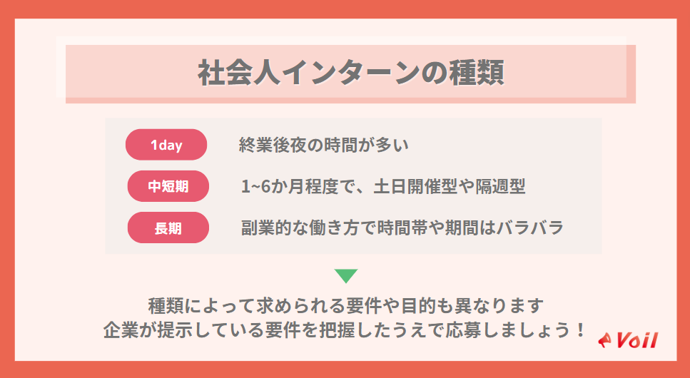 社会人インターンシップには、学生向けのインターンと同様にさまざまな種類があります。