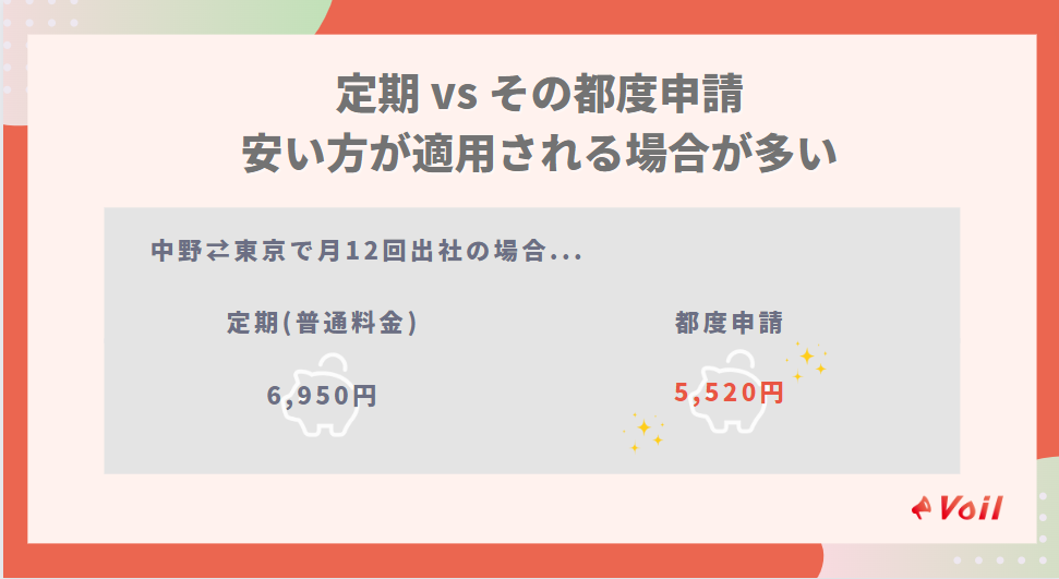 そのため、月あたりの出勤日数によっては定期券よりもその都度清算した方が安い場合があります。