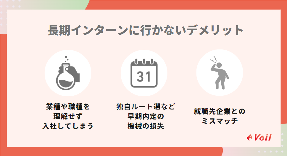 長期インターンに行かないと早期内定がもらえなかったり、ミスマッチが起きてしまったりなどデメリットがあります。