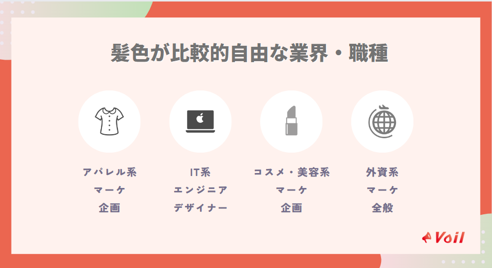 クライアントと直接会う業務が少なかったり、お洒落な服装で働ける職種だと、髪色に寛容な会社が多いからです。