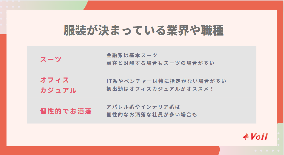 これらの会社は服装指定がないことが多いため、初出勤時はオフィスカジュアルな服装で周りの様子を見るのがおすすめです。