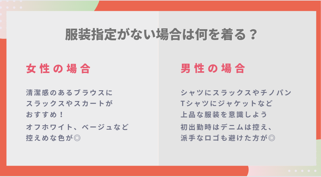 服装指定がない場合、どんな服を着ていけばいいか迷うと思います。