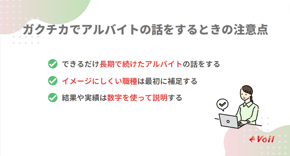 そこで、ここではガクチカでアルバイトの話をするときに気を付けたい注意点を3つ紹介します。