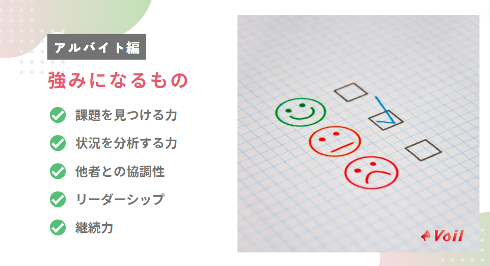 アルバイトでは、さまざまなことを経験できるため、何を学んだか、身に付けたことをアピールするのかが大事になります。