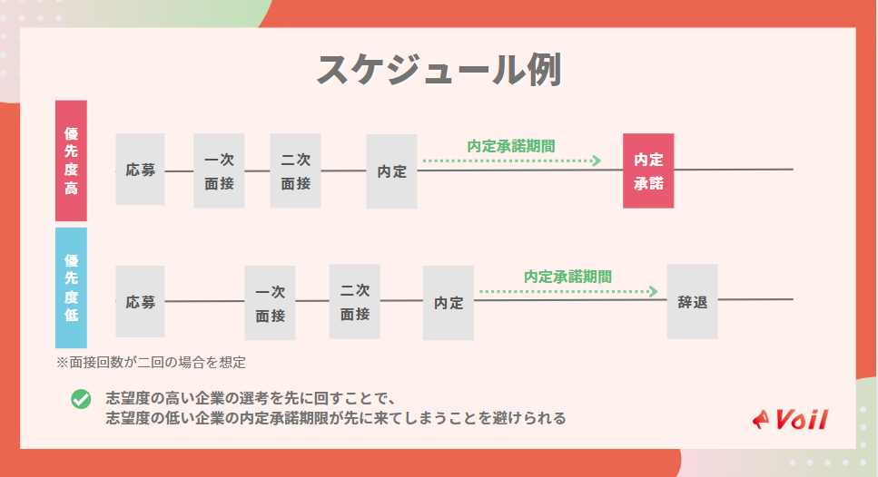 これを防ぐためにも、志望順位の高い企業の選考の方が早く進むように、選考スケジュールを把握して、応募日を調整しましょう。
