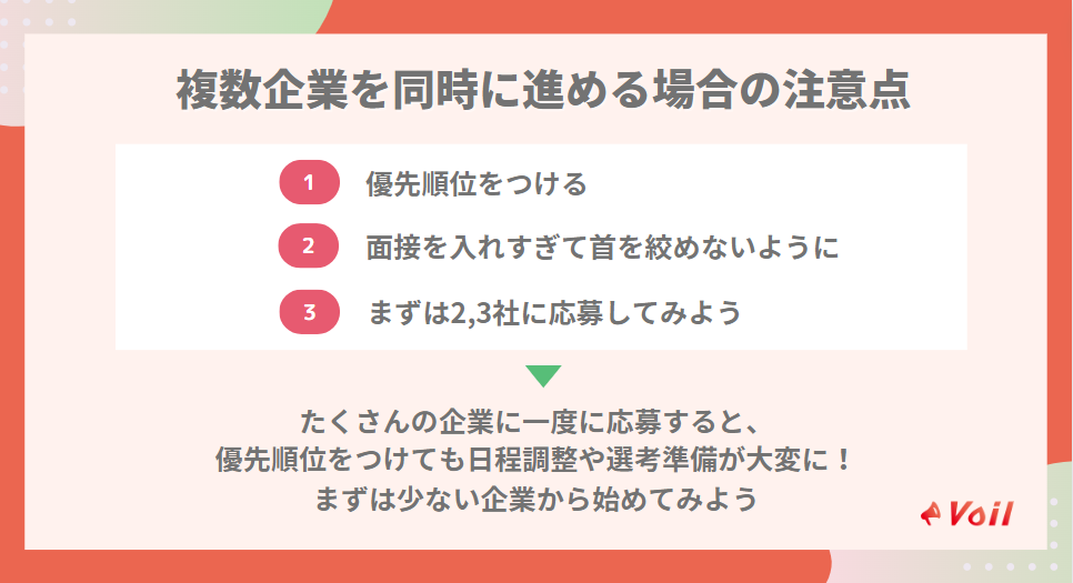 複数企業の選考を同時に進めるためには、いくつか注意点があるので、きちんとおさえましょう。